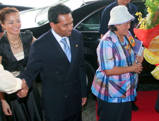 HRH Princess Maha Chakri Sirindhorn is welcomed by Thiri Dewe Sarathchandra (great great grand daughter of King Thibaw) and Saman Sarathchandra